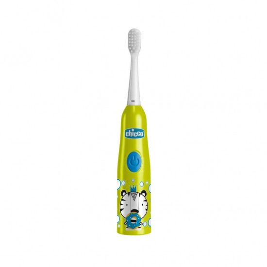 Titreşimli başlığı ve değiştirilebilir pilleri olan, pille çalışan elektrikli diş fırçası. Yeni Chicco diş fırçası iki farklı renkte mevcuttur.