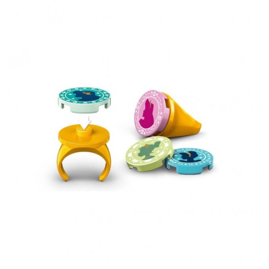 - Yaratıcı olanaklar– 4 bina, bir saksı, bank ve süs havuzunun olduğu daha küçük bir alan, ayrıca Ariel, Aurora, Sindirella ve Tiana LEGO® ǀ Disney Princess mini bebek figürleri bulunur
