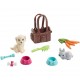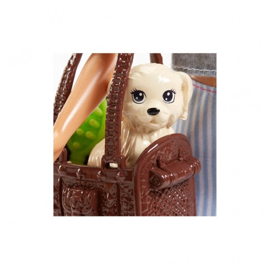 Barbie, iki sevimli evcil hayvan, bu hayvanların bakımı ve onlarla bağ kurulması için malzemeler içeren Barbie oyun seti, hayvansever çocuklara verilecek harika bir hediyedir. Barbie evini bu minik hayvancıklarla paylaşıyor. Taba rengi yavru köpek ve gri tavşan, sevimli ifadeleri ve eğlenceli duruşlarıyla çok şirin. Besleme, bakım ve oyun gibi temaları destekleyen aksesuarlar, hikayeyi zenginleştiriyor. İki mama kabı, bir deste havuç ve kemik, yemek zamanı için mükemmel bir fikir. Fırça ile evcil hayvan veya Barbie'nin saçı taranabilirsiniz. İpli oyuncak sayesinde yavru köpekle daha hareketli oyunlar oynanabilir. Ayrıca Barbie, kahverengi sepetinde hayvan dostlarından birini taşıyabilir. Hayvan dostlarını geride bırakmayı hiç sevmeyen Barbie, giyimiyle de sevgisini yansıtır: Gri atletin üzerinde pati baskılı pembe "love" (sevgi) çıkartması vardır. Mavi ve beyaz çizgili etek, beyaz ayakkabılar ve fiyonklu pembe saç bandı, Barbie'nin stilini tamamlar. Çocuklar, Barbie'nin hayvanlara bakmasına yardım etmeye ve bu hayvanları kendilerininmiş gibi sahiplenmeye bayılacak! Giysileri ve aksesuarlarıyla Barbie, yavru köpek figürü, tavşan figürü ve temaya uygun aksesuarlar içerir. Bebek tek başına ayakta duramaz. Renkler ve süslemeler farklılık gösterebilir.