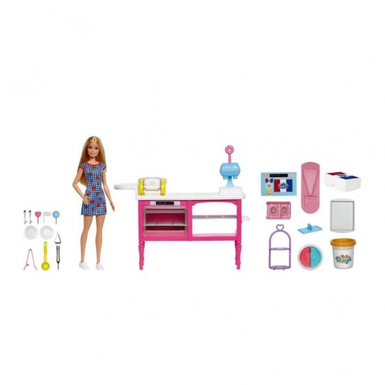 Barbie® It Takes Two™ dizisindeki ikonik mekandan esinlenilerek tasarlanmış mutfak tezgahı; çörek yapma makinesi, kruvasan yapma makinesi ve fırın gibi pek çok oyun alanı sunar.