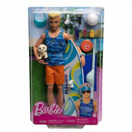 Çocuklar bu Ken bebekle en güzel plaj gününü oynayabilir; Bir sörf tahtası, köpek yavrusu ve kumsal hikaye anlatımı parçalarıyla birlikte geliyor.