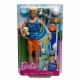 Ken bebek, parmak arası terliklerle sportif bir yüzme kıyafeti giyiyor ve oyuncu bir evcil köpek yavrusu ile geliyor.