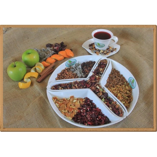 Dilimlenmiş kurutulmuş elma, portakal kabuğu, limon kabuğu, tarçın, hibisküs, kuşburnu, adaçayı, gül yaprağı kurusu içerir. İlave şeker içermez.
