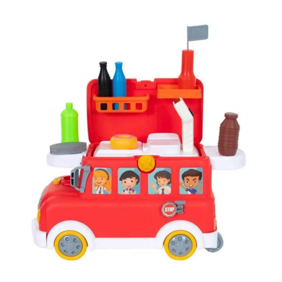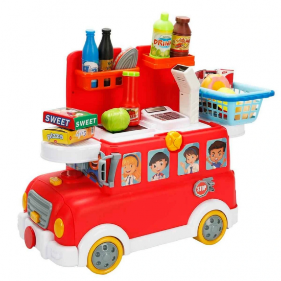 2in1 Sesli ve Işıklı Süpermarket Otobüsü Oyun Seti 28 Parça, oyun saatlerini bambaşka bir boyuta taşıyor. Raflarda içecekler,