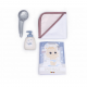 Set, bebeğin duştan sonra üşümemesi için yumuşak havludan yapılmış kapüşonlu bir havlu içerir. Duşun yan duvarındaki kancalara