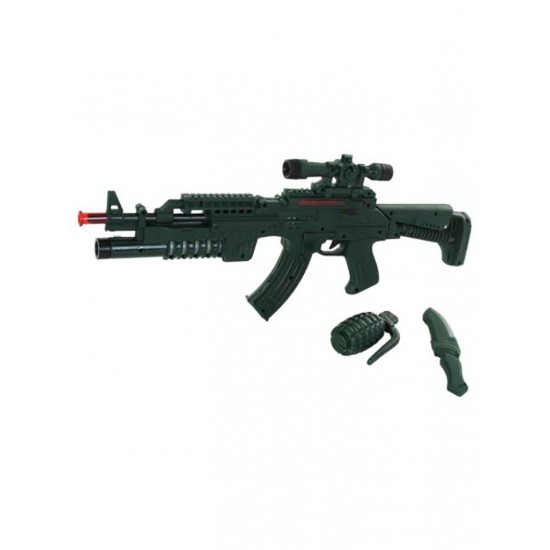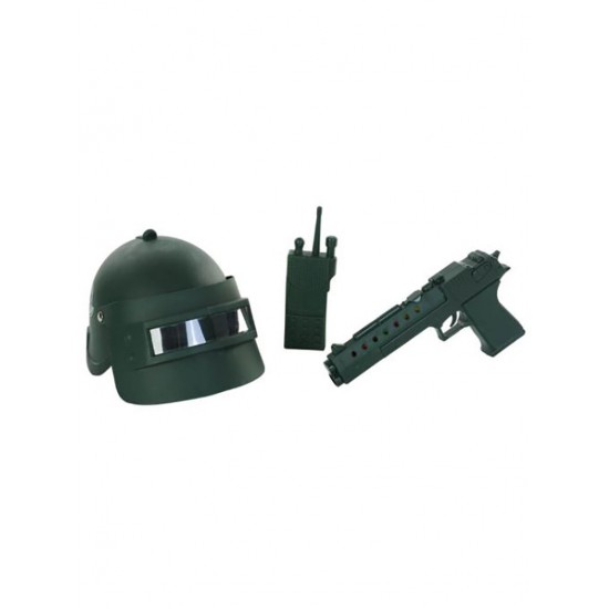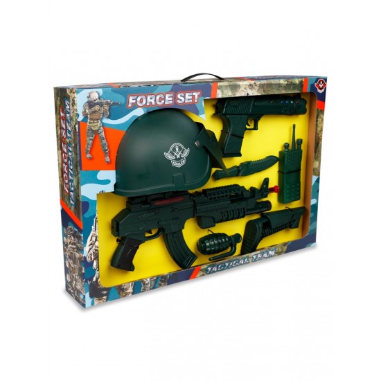1 adet oyuncak otomatik silah ve tabanca, kask, telsiz, bıçak, el bombası ve çeşitli aksesuarlar bulunmaktadır.