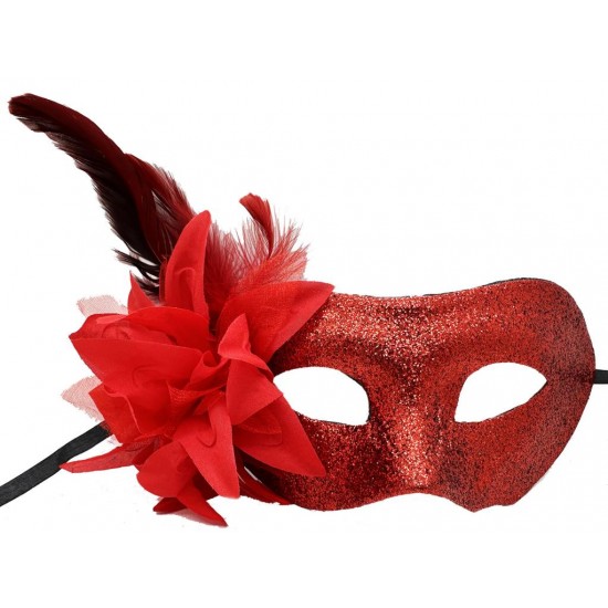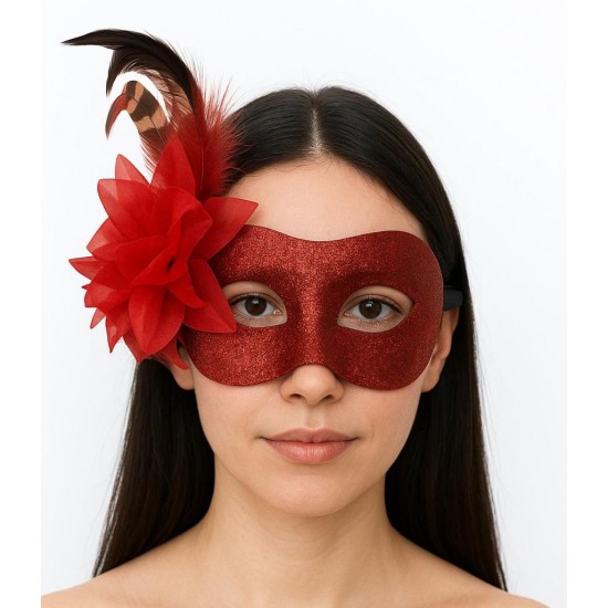 Kırmızı Renk Metalize Sim Görünümlü Parlak Tüylü Parti Maskesi 22x19 cm