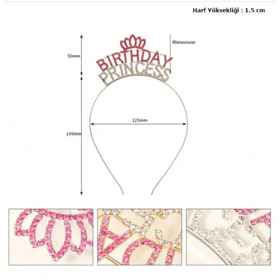 Kristal Taşlı Pembe Birthday Princess Yazılı Parti Tacı 19x11 cm