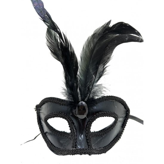 Siyah Renk Rugan Kaplama Kırmızı Tüylü Parti Maskesi 18x20 cm