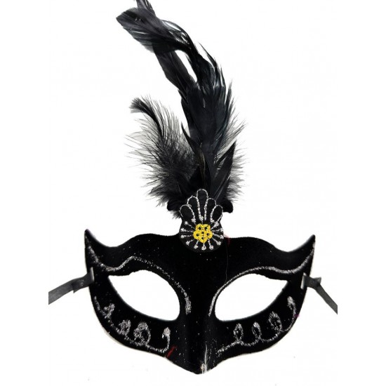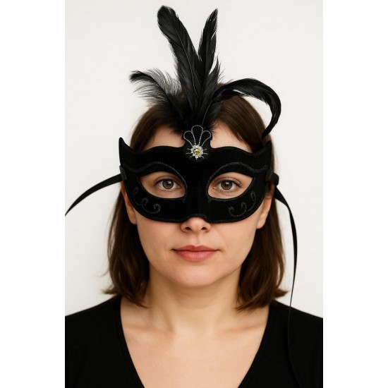 Siyah Renk Tüylü Siyah Süet Kaplama Parti Balo Maskesi, balolar, maskeli partiler veya kostüm partileri gibi özel günlerde gizemli ve karizmatik bir görünüm elde etmek isteyenler için mükemmel bir seçimdir. Siyah süet kaplaması ve yandan sarkan tüyleri ile bu maske sizi partinin en gizemli ve karizmatik konuğu yapacak.