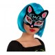 • Siyah süet kaplama ve mavi ve kırmızı simlerle süslenmiş, kedilerin sevimliliğini ve gizemini yansıtan bir maske tasarımı.