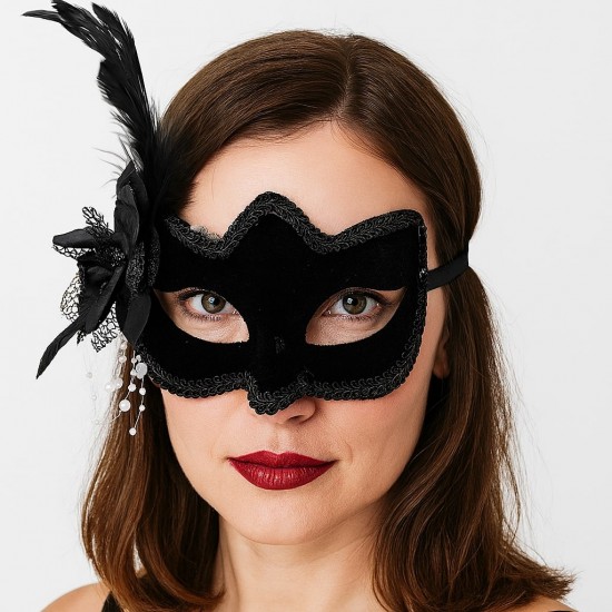 Siyah Renk Süet Kaplama Yandan Tüylü Beyaz İncili Parti Maskesi, balolar, maskeli partiler gibi özel günlerde gizemli ve göz alıcı bir görünüm elde etmek isteyenler için mükemmel bir seçimdir. Yumuşak süet kaplaması ve zarif beyaz incileri ile bu maske sizi partinin yıldızı yapacak.