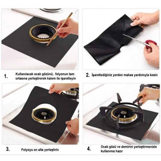 Paket içeriği: 4 adet Ocak Koruyucu Folyo Yanmaz Yapışmaz SiYAH